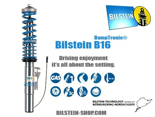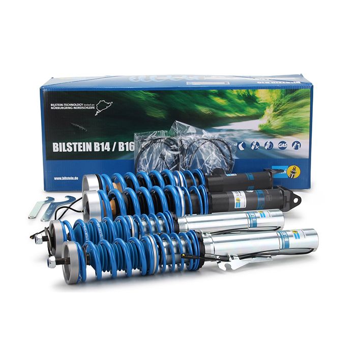 The Bilstein B16 suspension kits (DampTronic) feature ground clearance adjustment with shock absorbers compatible with OE electronic damping systems. All active features of the factory electronic suspension, along with the factory controls, will be retained with the installation of this kit. These kits offer high performance monotube shock absorbers with matching springs tuned for each specific application. The zinc coated and threaded body design will give you the flexibility to find the perfect ground clearance setting for your intended use, while providing unsurpassed protection against the toughest road elements. The B16 suspension kits (DampTronic) are made in Germany and feature technology tested on the famous Nurburgring.